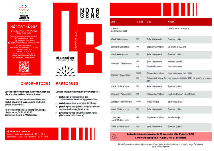 Retrouvez dans ce Nota Bene toutes les animations gratuites proposées en décembre à la Médiathèque du Bassin d'Aurillac.